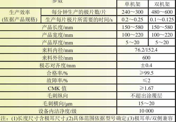 热复合式叠片机设备的主要技术参数如表1所示,主要包括生产效率、产品范围、极芯对齐度、合格率、CMK值、设备内洁净度等,产品的具体尺寸规格可依据其型号具体确定,其尺寸只要在设备能够制造的产品范围内即可。