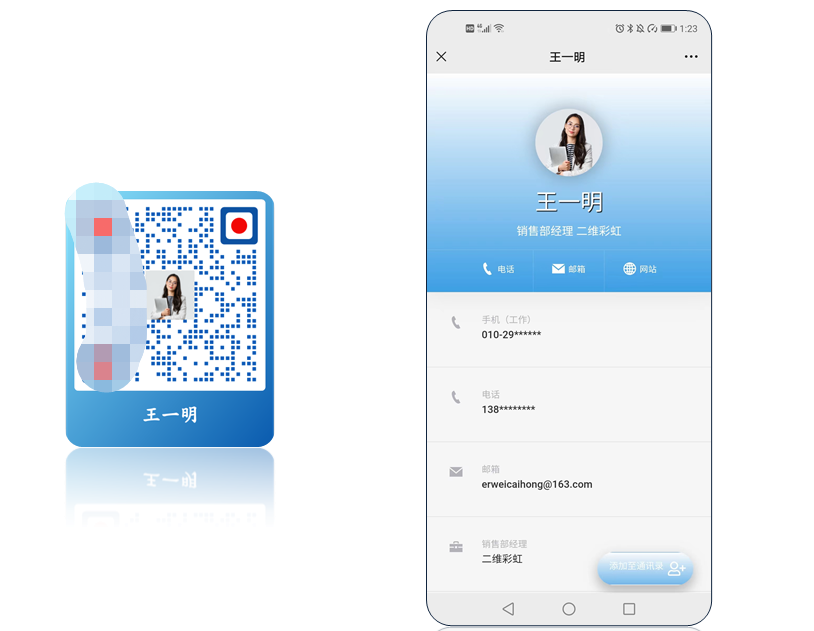 扫描左边的名片二维码,就会看到右边的界面,这里显示了名片主人的:头像、名称、职位、就职公司、联系电话、邮箱,还有企业官网链接等。还可以将这个名片信息一键保存至手机通讯录,这样就可以轻松将对方添加至你的通讯录朋友列表中。方便以后随时联系!