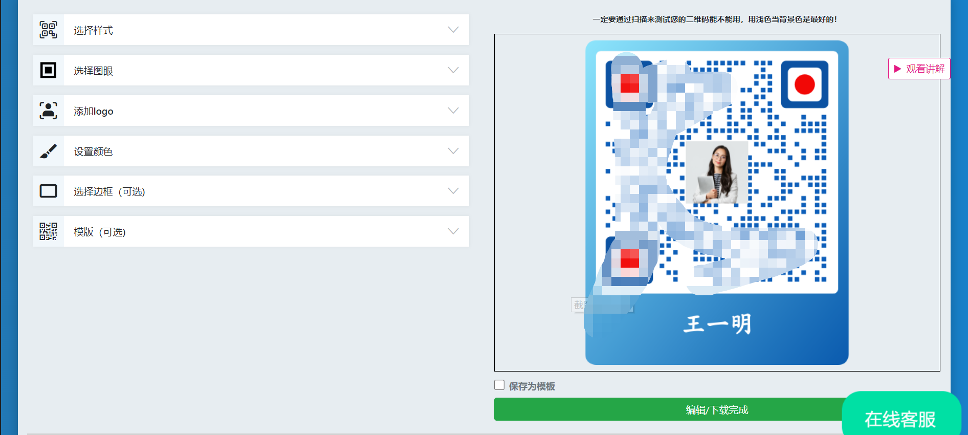 设计完了后,再进行扫描测试,确认颜色、设计、名片二维码内容都没问题,且可以被正常扫描识别,就可以下载了。