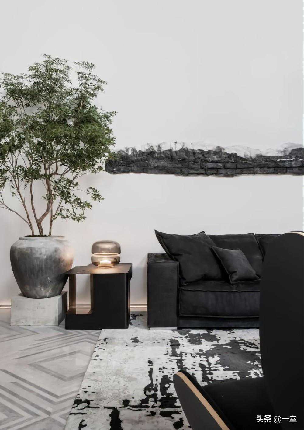 挑空开放的门厅及客厅,家具陈列呈现不规则形态,像艺术品一般来进行陈列。墨黑的沙发、巨型水墨地毯、墙面的纸墨装置,都阐述出了东方美学的水墨文化。