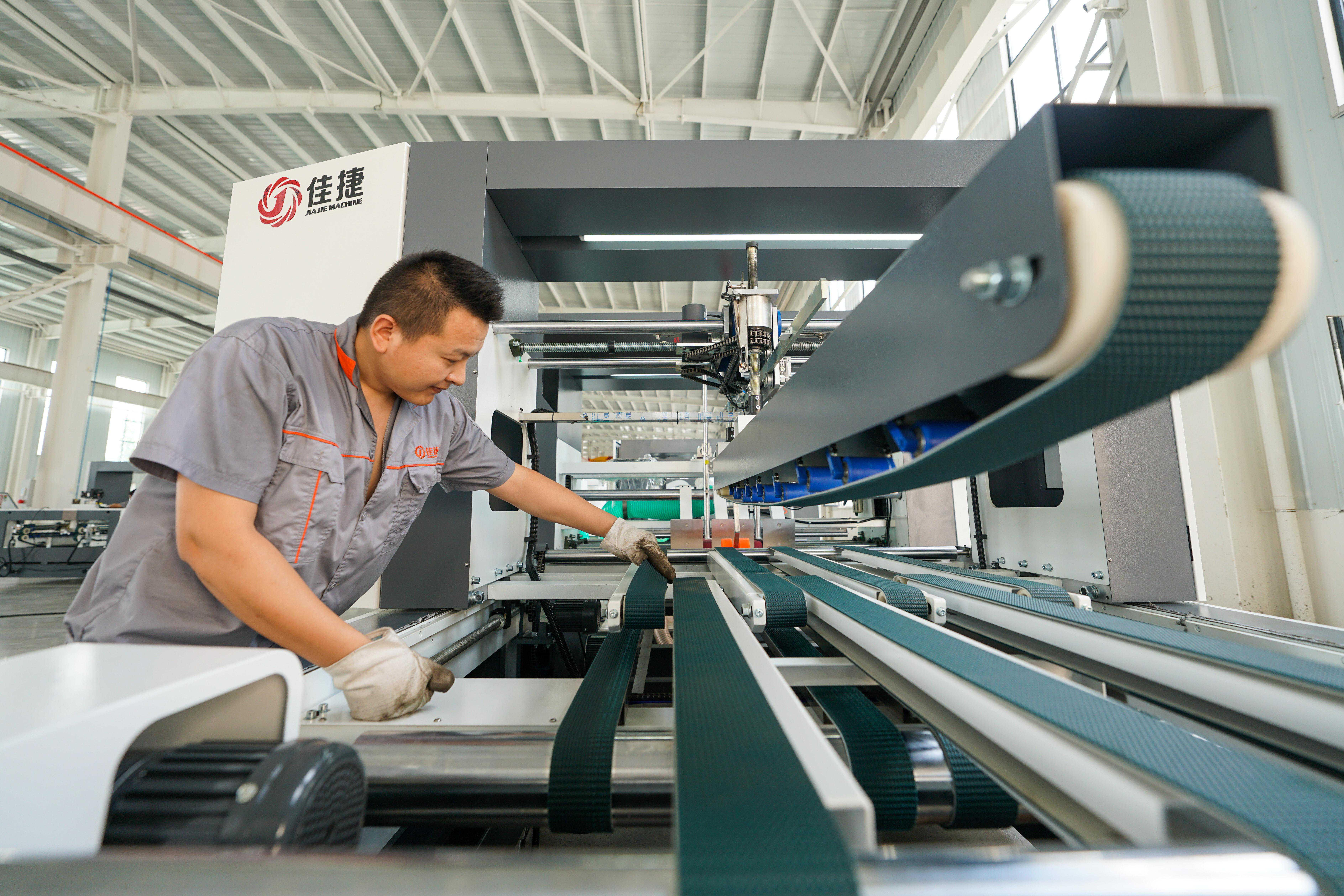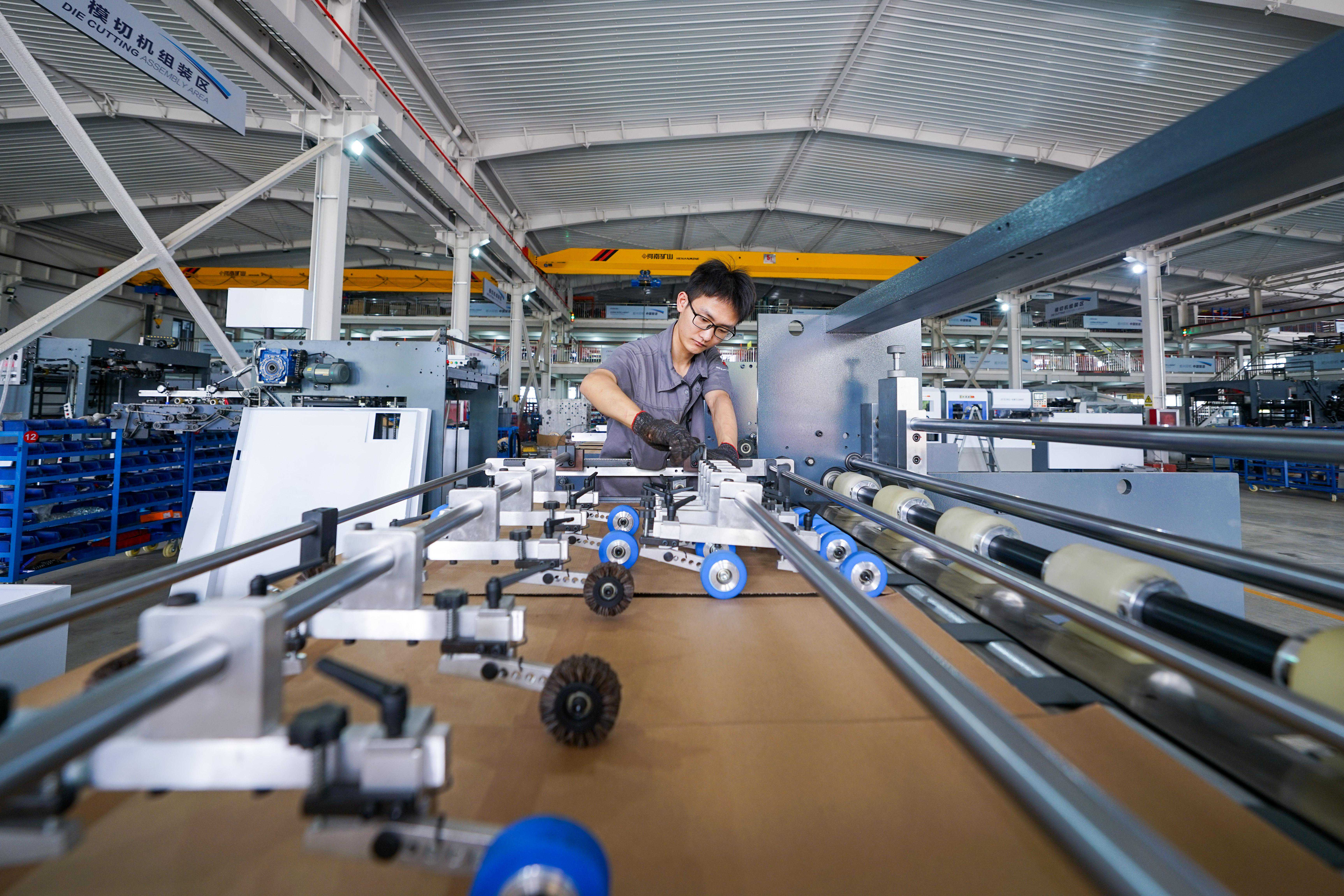 7月13日,河北省玉田县一家印刷包装机械制造企业的工人在调试产品。新华社记者牟宇摄