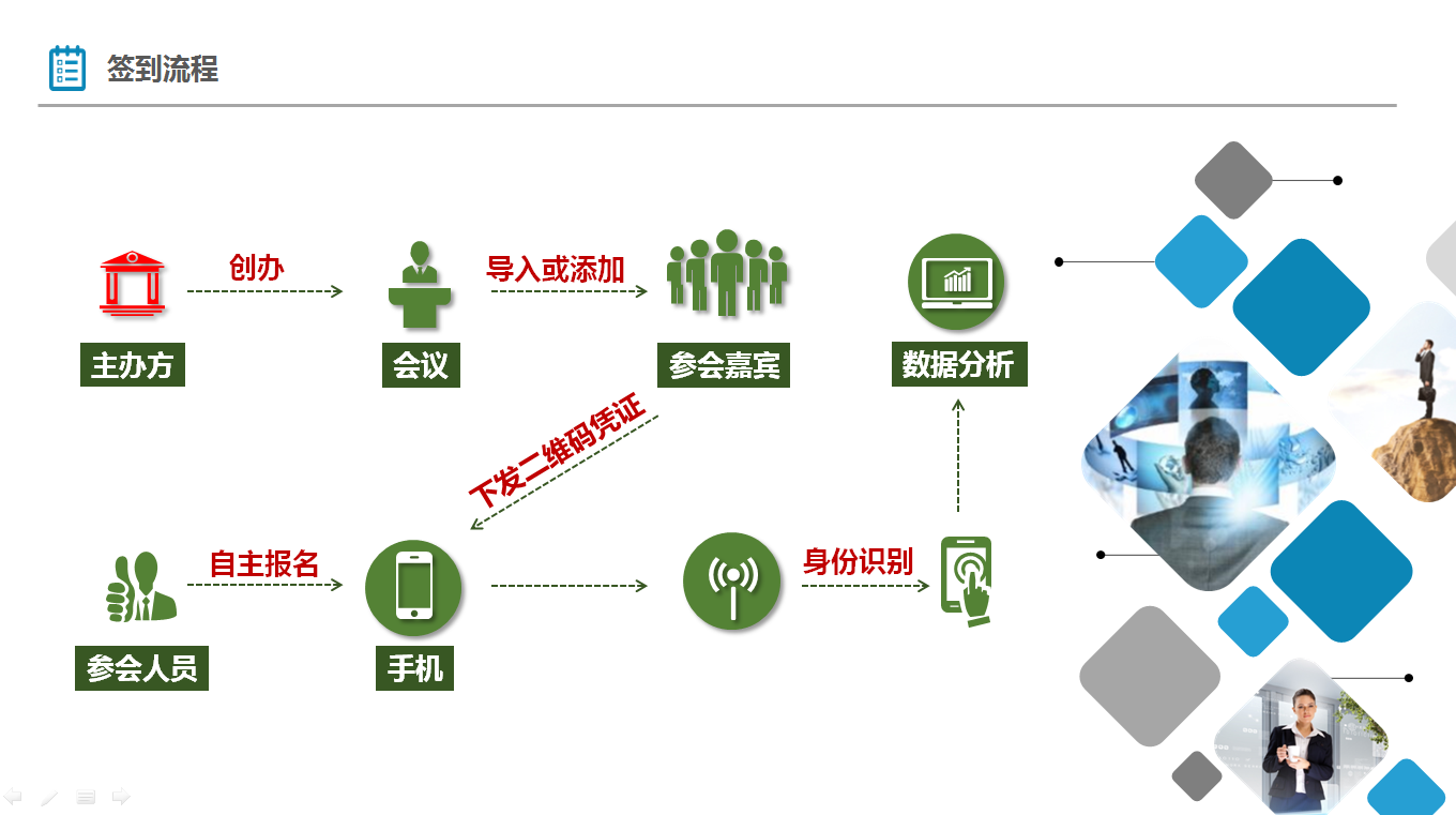 二维码数字会务管理的亮点:二维码签到不仅解决成本,并且快速高效的完成签到过程。近年来,二维码已在会议活动的签到中得到越来越多的应用,将来有望取代传统签到方式。首先它的创意二维码凭证与电子邀请函。电子会议签到系统可以为各种会议、公关活动制作别具匠心的电子邀请函,内容可包括动态显示的图片、详细的活动介绍、地图等信息,更有用于签到的个人专属二维码。这种电子邀请函以其创新的表现方式、时尚的体验,将迅速吸引来宾的注意,而贴心的内容更能博得来宾的好感。其次是它绿色环保电子签到形式。电子邀请函以彩信方式发送给参会人员,参会人员只需凭接收到的二维码彩信即可参会,既节约成本、精准派发,又符合当今社会倡导的“低碳环保”概念。