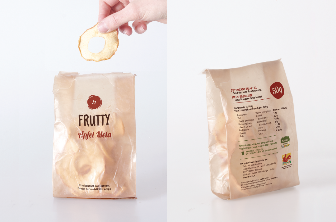 纤维素的吸水性很强,但同时又比普通的纸更耐水,因此适合装许多类型的干粮,如面粉、米、茶叶、干果等。她用苹果培养的细菌纤维素做成了苹果干的包装袋,从果皮中培养出果实的包装。
