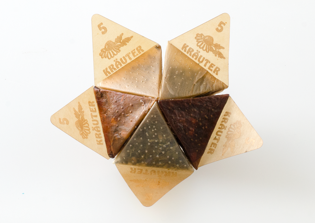为了把食品包装变得更美,身为设计师的Emma把不同食品废料生长的细菌纤维素设计成糖果包装和茶包,还利用激光雕刻进一步赋予材质设计的元素。