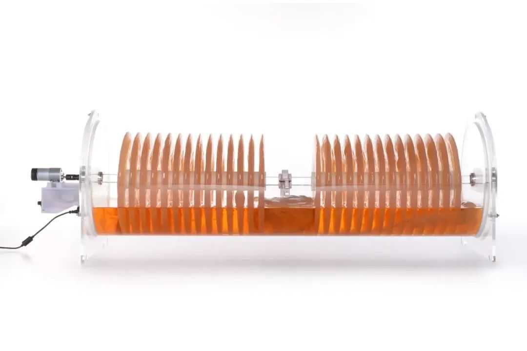 在一个容器中垂直放置会旋转的圆盘,微生物会附着在不断旋转的圆盘上动态生长。经过测试,InnoCell生物反应器提供了明显更高的产量,目前版本每个周期可产生12-15公斤的湿质量,每个圆盘约500克。