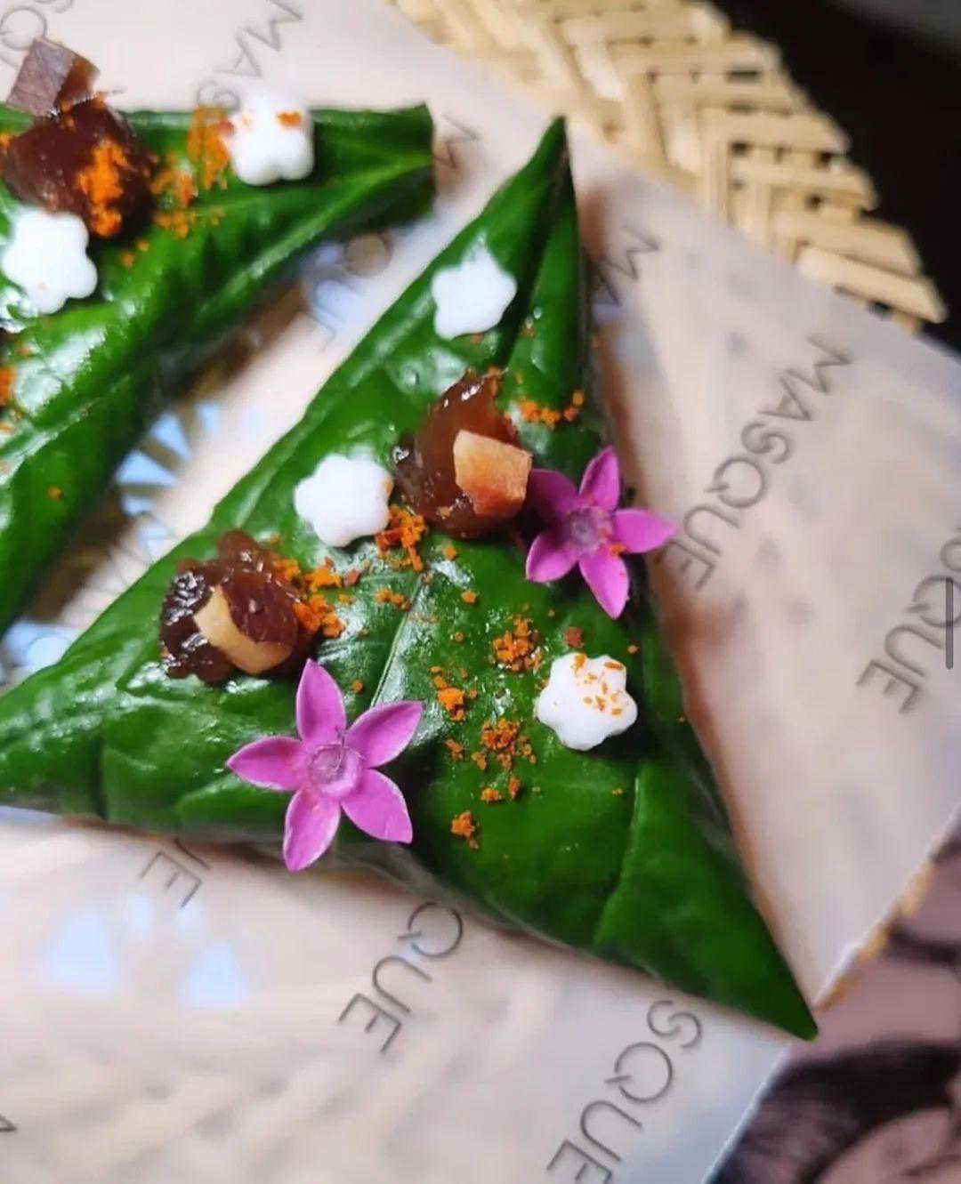 细菌纤维素本身的胶质和高吸水性还能够让它被制作成不同口味的软糖。在MasqueLab,主厨则通过制糖的方法将细菌纤维素变成了糖粒,和椰子、槟榔叶等材料组合成了甜品。