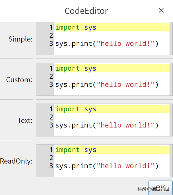 ,Str,Regex,List,,View,TreeEditor,TreeNodeclassEmployee(HasTraits):constantlabelview=no_view,add=[Department],),TreeNode(node_for=[Company],auto_open=True,children='employees',label='=Employees',labelwithDepartmentnameview=View(['name']),add=[Employee]),TreeNode(node_for=[Employee],auto_open=True,label='name',窗口标题名。大小,按钮oktitle='CodeEditor',width=600,height=600,buttons=['OK'])demo=CodeEditorDemo()if__name__=="__main__":_traits()