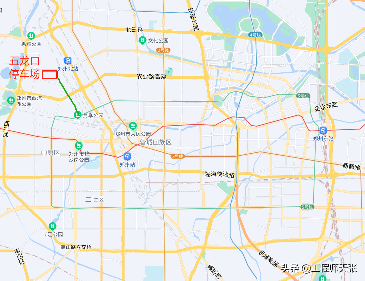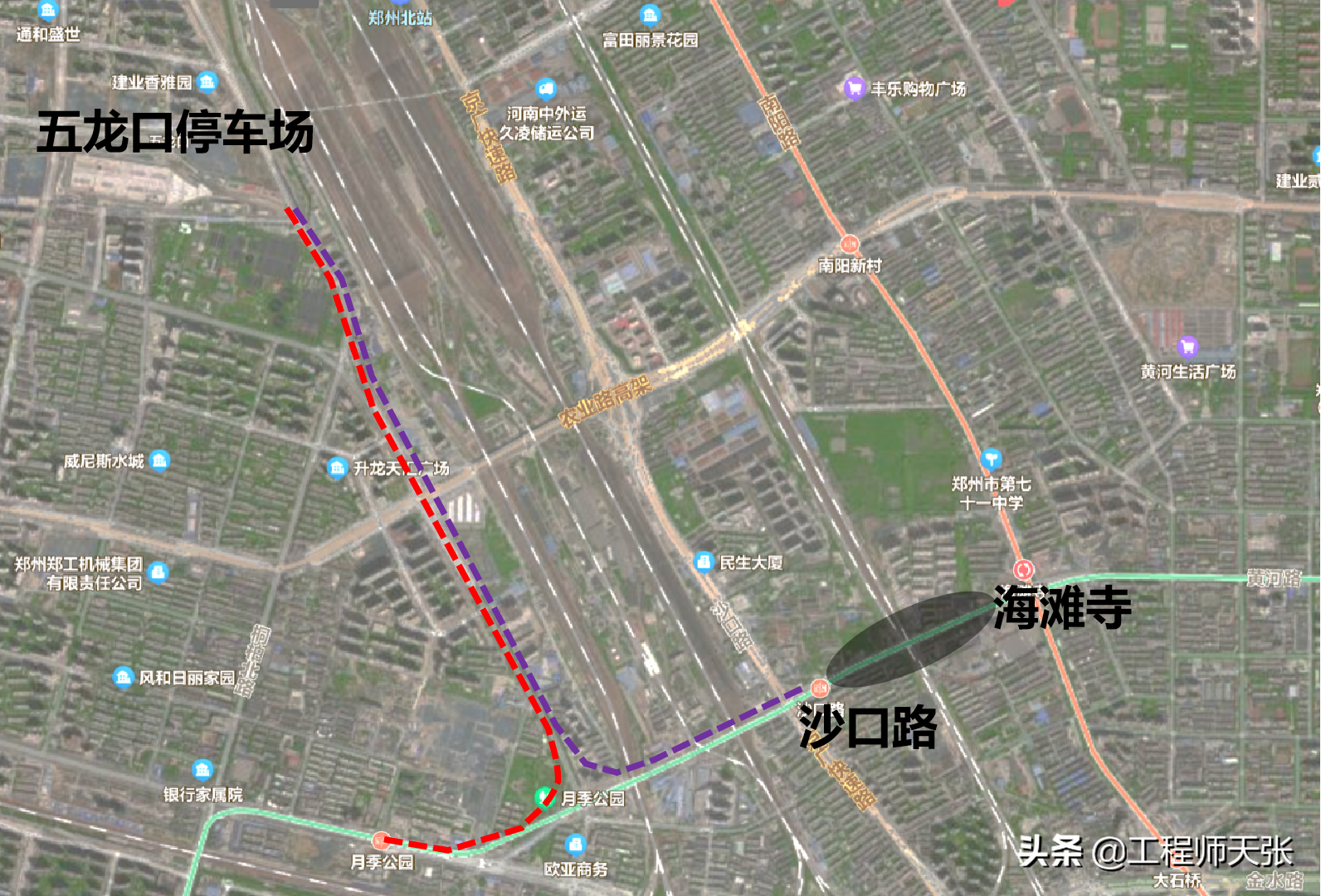 郑州地铁5号线的停车场就设置在五龙口,位于5号线整条环线的西北角,距离正线上比较近的有月季公园、沙口路和海滩寺3站。