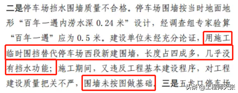 为什么挡水围墙没起作用呢?《报告》中明确指出“用施工临时围挡代替停车场西段新建围墙,长度占四成多,几乎没有挡水功能”、“停车场多处临时围挡倒塌”、“围墙未按图纸做基础”,这一些列的问题叠加,终酿大祸。