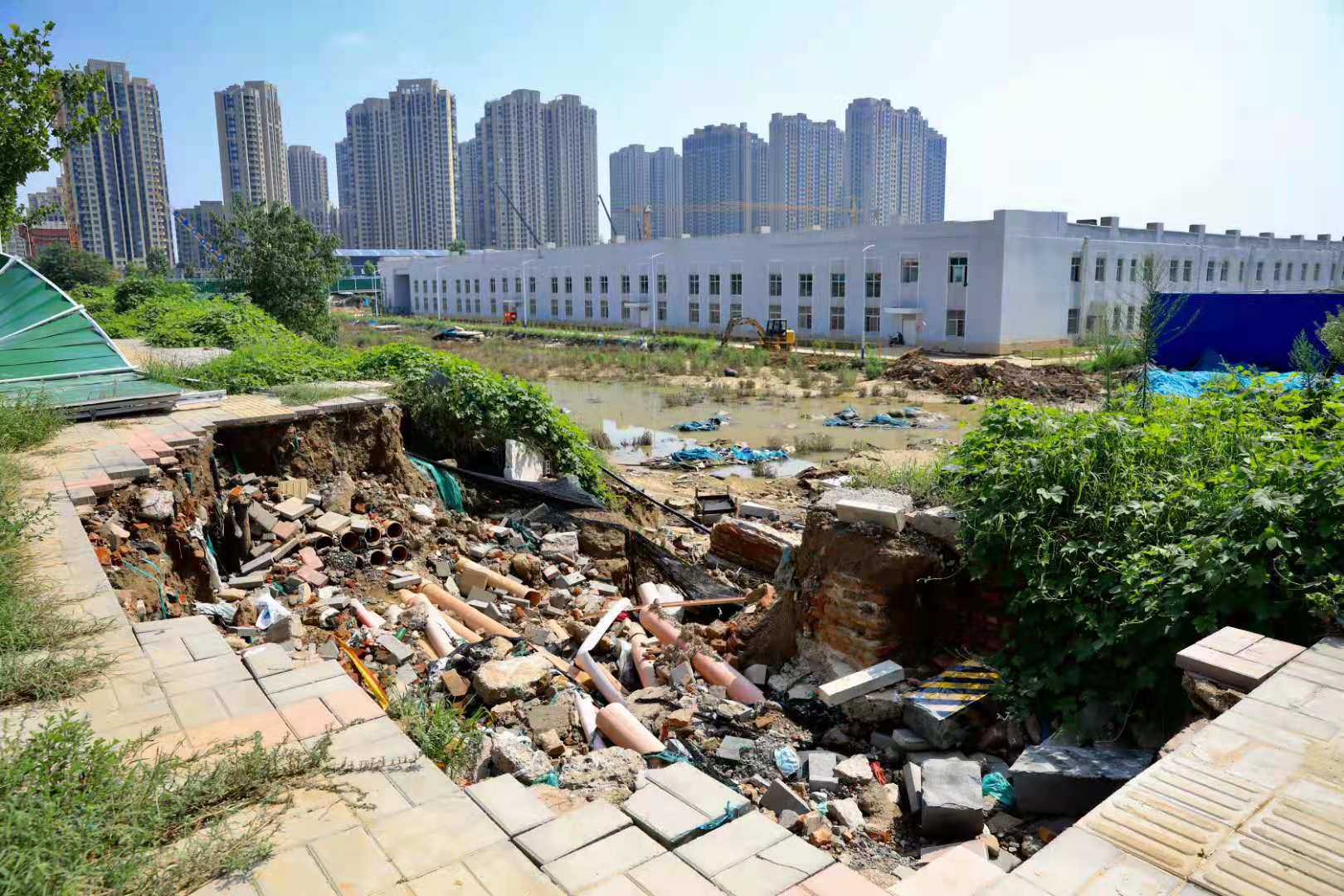 先看进水口3,它位于停车场最东侧,紧靠蓝天路,恰好位于停车场进出场线从地下钻出地面的关键位置,这里最低,涝水一旦进入,将无法补救。从拍摄的现场图片来看,围墙用实心砖简单砌筑而成,报告显示根本没有做基础处理,自然水一冲就倒塌了。