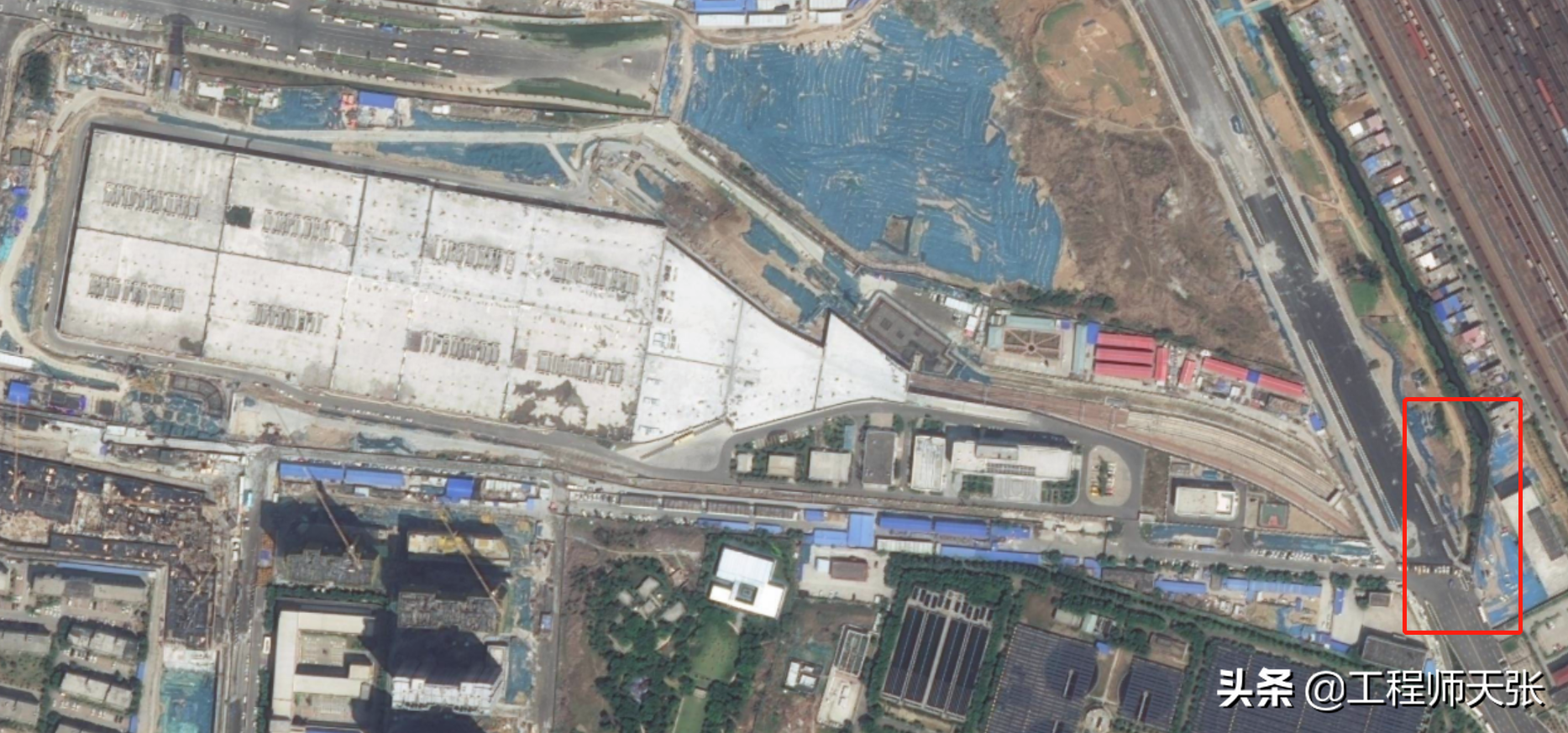 停车场运用库(右侧)明显比临近市政道路东风西路(左侧)低洼