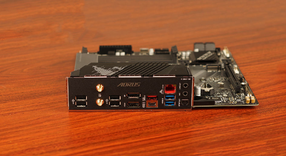 主板采用MATX设计,尺寸为24.4,采用黑色PCB搭配银钛灰色金属I/O饰板,PCB表面加入了灰色的线条作点缀,此外I/O饰板上加入了AORUS鹰头LOGO,支持RGBFusion灯效控制。