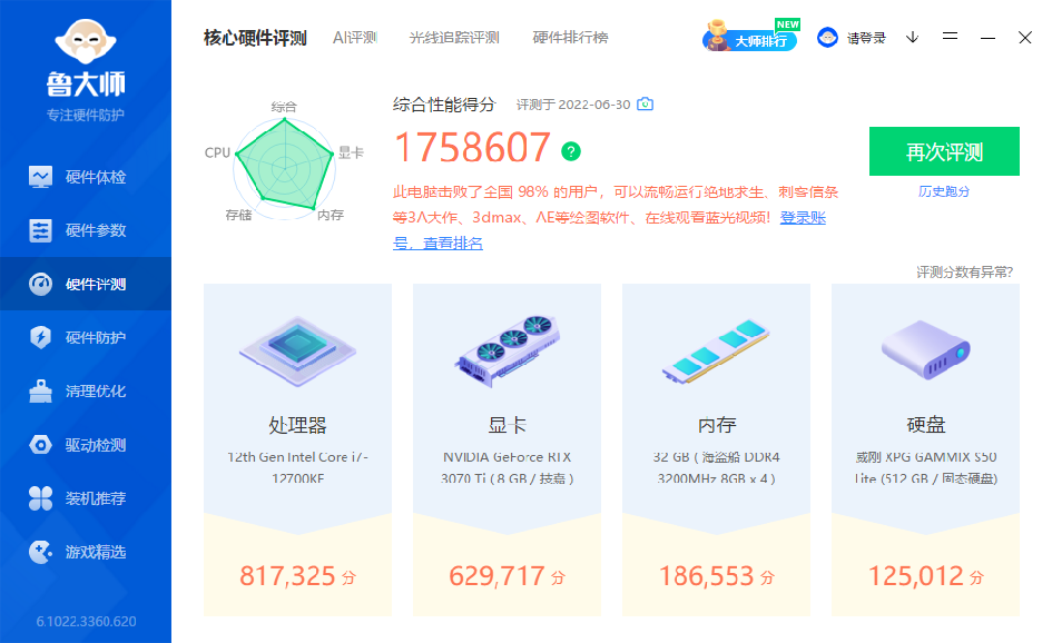 综合性能175万,CPU81万,显卡62万,内存18万,硬盘12万。