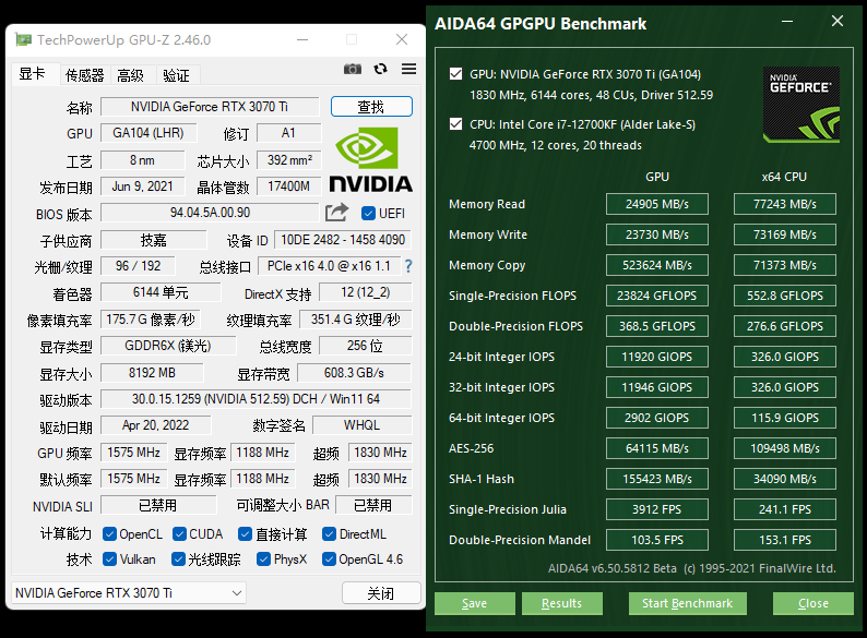 技嘉RTX3070Ti雪鹰VISIONOC8GGPU-Z信息及AIDA64测试