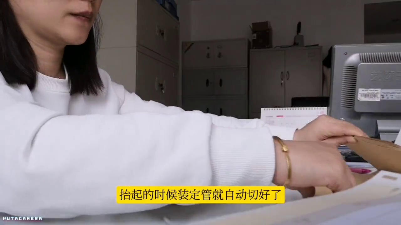 ·整理好以后就把凭证放在打孔的地方,调整好要打的位置,不要打偏。用右边的把手用力向下按,抬起的时候装订管就自动切好了。
