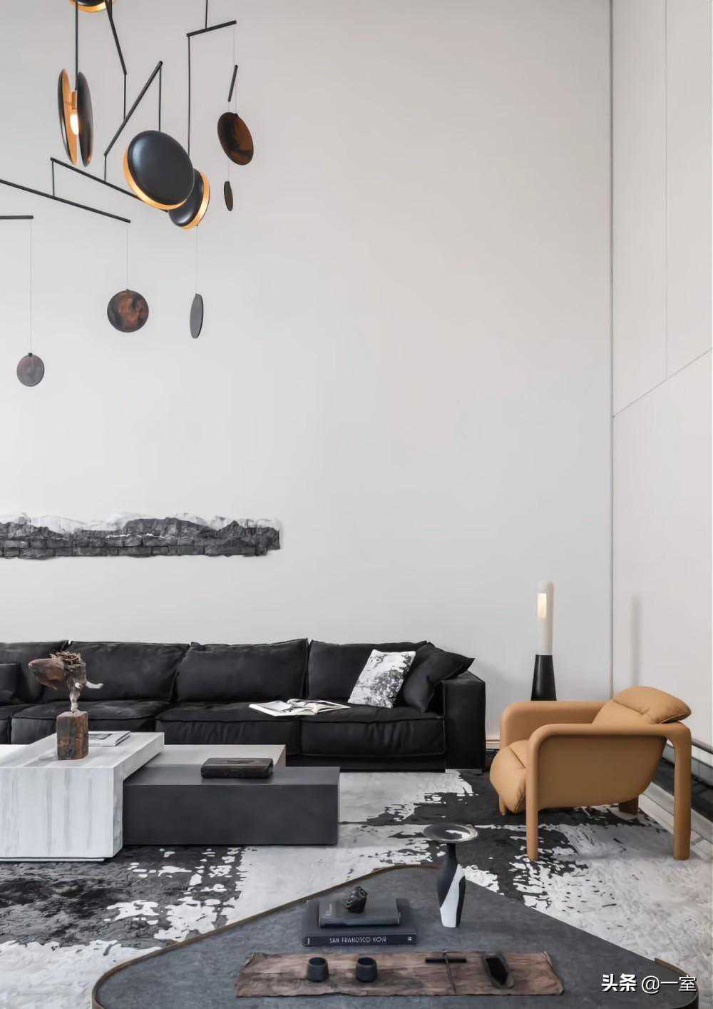 挑空开放的门厅及客厅,家具陈列呈现不规则形态,像艺术品一般来进行陈列。墨黑的沙发、巨型水墨地毯、墙面的纸墨装置,都阐述出了东方美学的水墨文化。