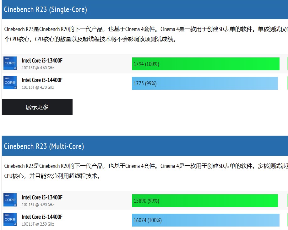 在CinebenchR23平台中,Corei5-13400F的单核性能得分为1794分,多核性能得分为15890分,Corei5-14400F的单核性能得分为1773分,多核性能得分为16074分。