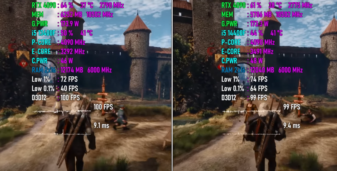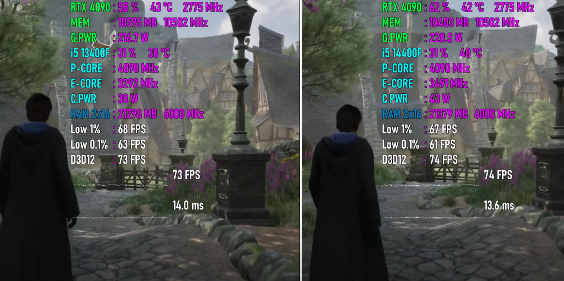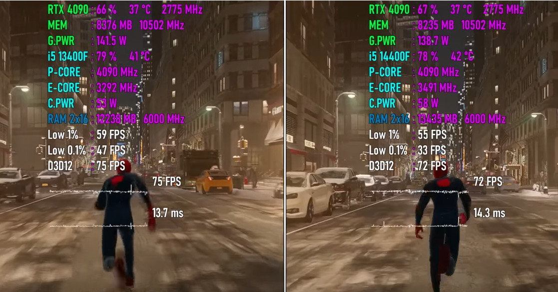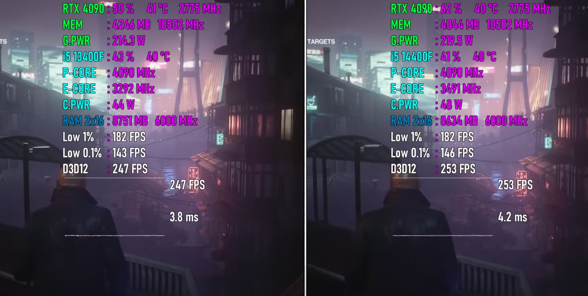 以下将分别测试七款游戏,均采用1080P最高画质模式,以下系列图片中左边代表Corei5-13400F平台,右边代表平台。
