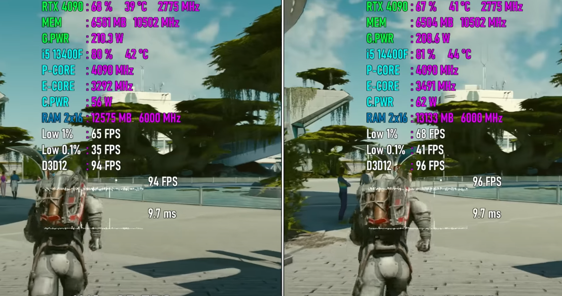 在平均帧速方面,Corei5-14400F平台比Corei5-13400F平台低1FPS,最低瞬时帧速高2FPS,帧时间高0.3ms,功耗高2W,温度持平。