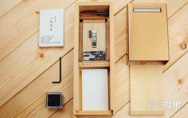 这个一张名片的最大特点是,它是一个微缩版的活字印刷工具。外观方面一共有黑色、原木色、檀木制成的限量款三种。