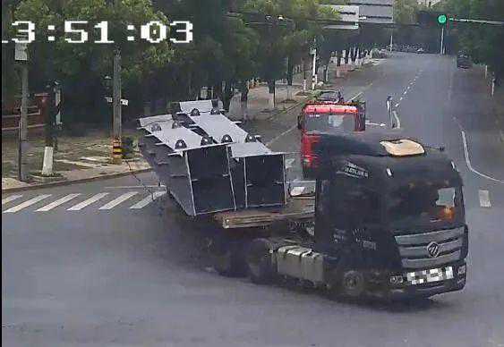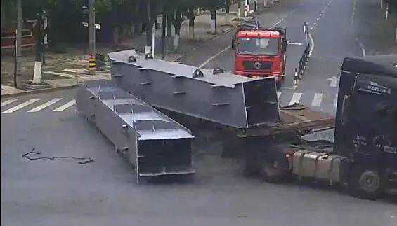 “嘭!”5月12日下午,在湖州市德清县钟管镇一红绿灯路口,一辆大货车在左转弯时,因捆扎不规范和转弯时车速较快,导致大货车上的货物脱离捆绑掉落地面。