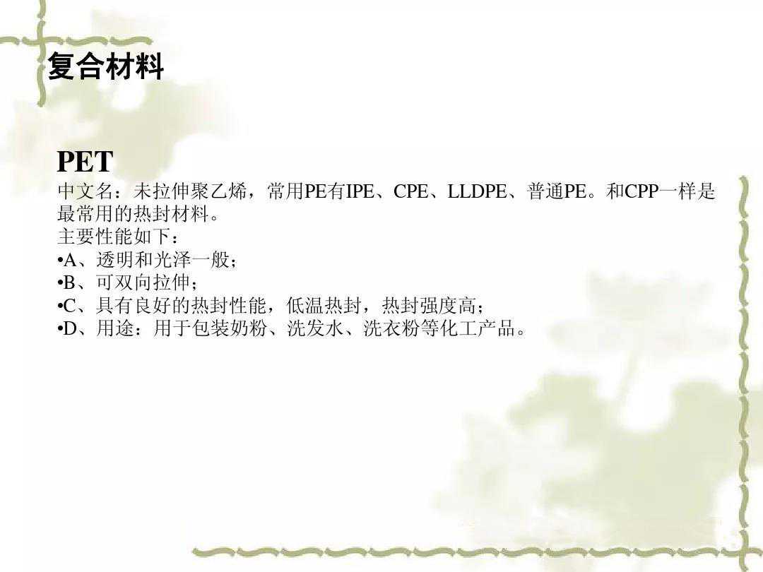 基本结构为:为了满足蒸煮袋性能的要求,其结构外层选择强度高的聚酯薄膜,中间层选择具有遮光和气密性的铝箔,内层则选用聚丙烯薄膜。两层:PA+CPP三层:PA+PET+CPP四层:PA+PET+AL+CPP