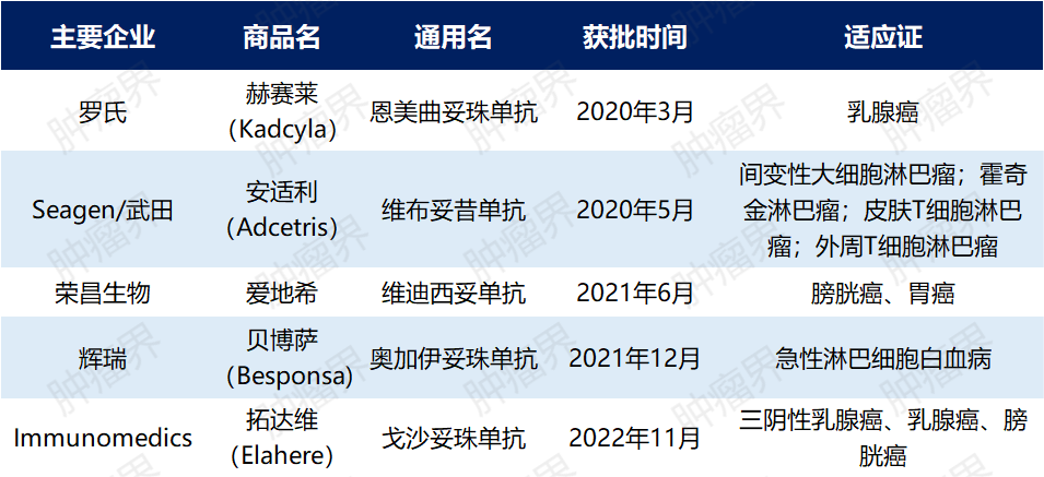 2022年底,全球已有15款ADC药物获批上市,分别是辉瑞的Mylotarg、Besponsa,罗氏的Kadcyla、Polivy,阿斯利康的Lumoxiti、Enhertu,Seagen/武田制药的Adcetris,Seagen/安塞泰来的Padcev,Seagen/Genmab的Tivdak,葛兰素史克的Blenrep,吉利德的Trodelvy,RakutenMedical的Akalux,ADCTherapeutics的Zynlonta,荣昌生物的爱地希,以及2022年11月15日获批ImmunoGen/华东医药的Elahere,治疗疾病涉及淋巴瘤、白血病、乳腺癌、多发性骨髓瘤、乳腺癌、头颈癌、尿路上皮癌等。