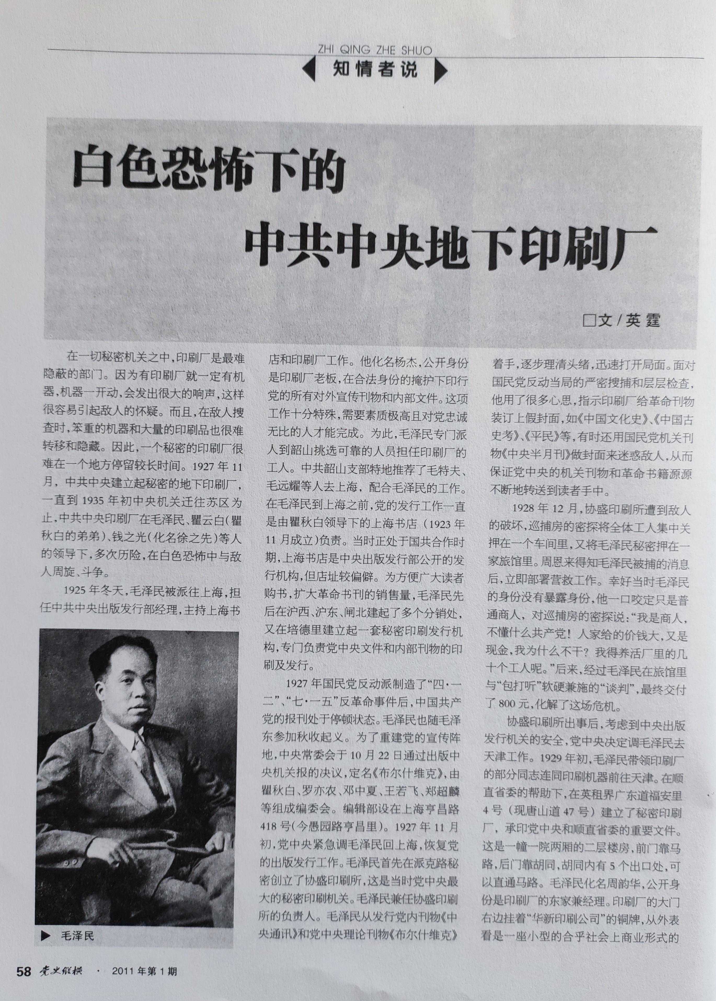 1927年,国共关系破裂以后,在白色恐怖之下,中共中央的工作机关被迫从公开转入地下。在一切秘密机关之中,印刷厂是最难隐蔽的部门。因为有印刷厂就一定有机器,机器一开动,就会弄出很大的响声,这样很容易引起敌人的怀疑。而且,在敌人搜查时,笨重的机器和大量的印刷品也很难转移和隐藏。因此,一个秘密的印刷厂很难在一个地方停留较长时间。1927年11月,中共中央建立起秘密的地下印刷厂,一直到1935年初中共中央机关迁往苏区为止,中共中央印刷厂在毛泽民、瞿云白(瞿秋白的弟弟)、钱之光(化名徐之先)等人的领导下,多次历险,在白色恐怖中与敌人周旋、斗争。