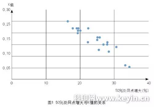这次大赛的参评报纸均为开印后第1000份报纸,我们取报纸2、3版的黑版平均K值(报纸2、3版有16处测控点,取平均值)和相对应的50%处网点增大的数据进行分析,发现部分报纸由于墨未走匀,会出现墨小导致网点偏小、墨大导致网点增大失实的情况。我们剔除这部分数据,随机取20组数据,可得到50%处网点增大与K值的关系,如图1所示。