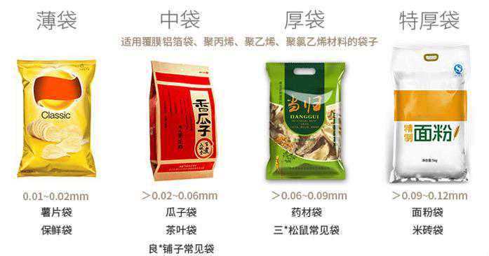 无论是薄包装的瓜子薯片袋,还是特厚装的面粉袋,均在适用范围内。有所不同的是,封口机预热的时间长短和温度高低。
