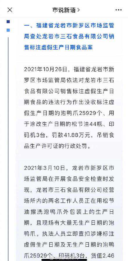 12月6日,国家市场监管总局曝光2021民生领域一批与群众紧密相关、性质恶劣的违法案件。2021年10月26日,福建省龙岩市新罗区市场监管局依法对龙岩市三石食品有限公司销售标注虚假生产日期食品的违法行为作出没收标注虚假生产日期的泡鸭爪25929个、用于涂改生产日期的松节油44瓶、印码机3台,罚款41.88万元,吊销食品生产许可证的行政处罚。