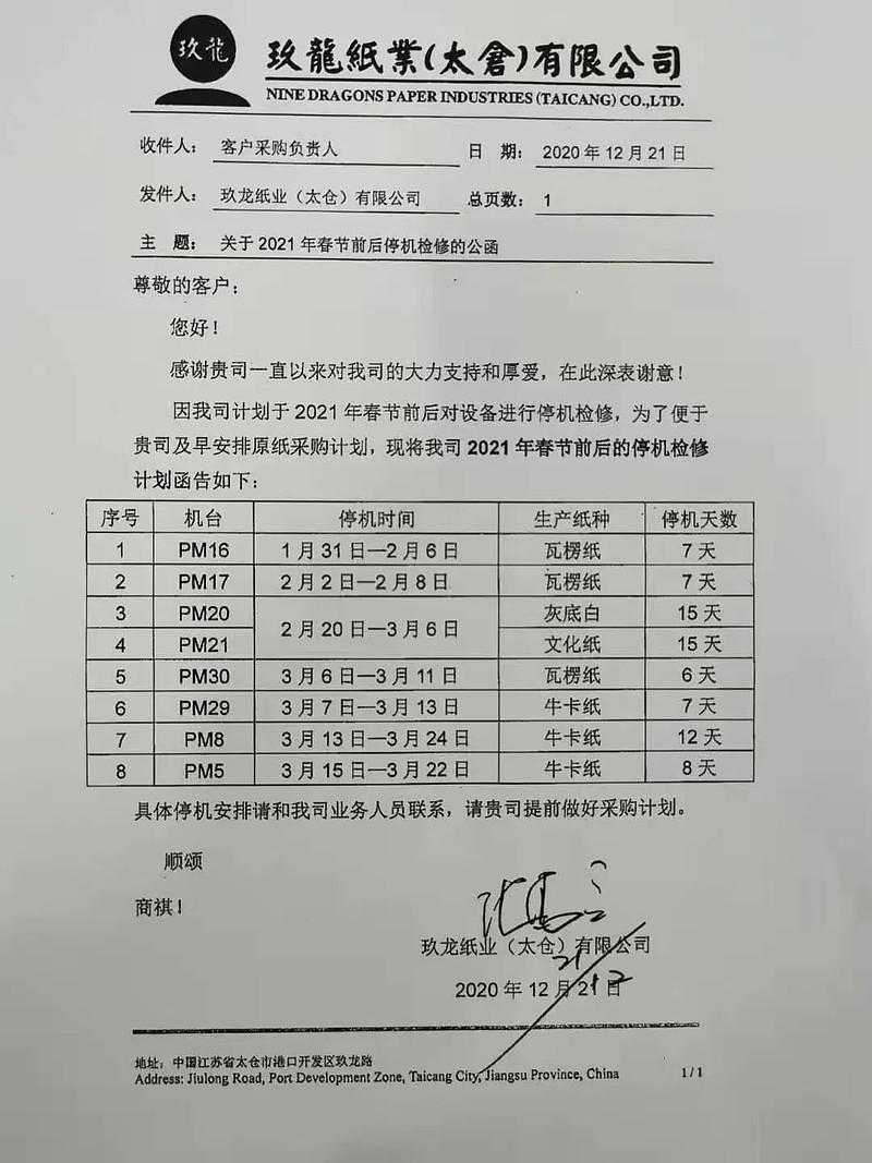 随着时间推移,玖龙再次公布新的停机计划,太仓玖龙8台纸机将于春节前后陆续停机检修,累计总停机时长77天。