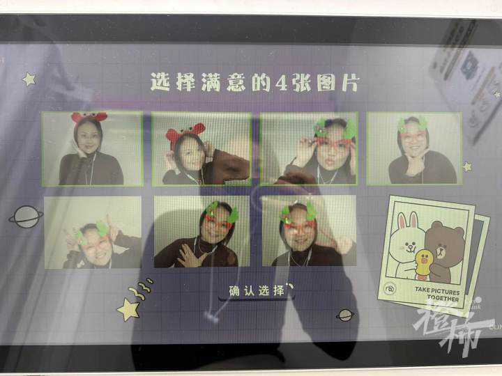 在她俩的带动下,记者也体验了一下。整个过程就三分钟左右,全部自助,扫码付款后就可以在屏幕挑选喜欢的背景和排版,风格偏简约现代,不像早年间大头贴机那么“傻瓜”和“杀马特”,确认后马上开始拍摄,每张照片倒计时15秒。