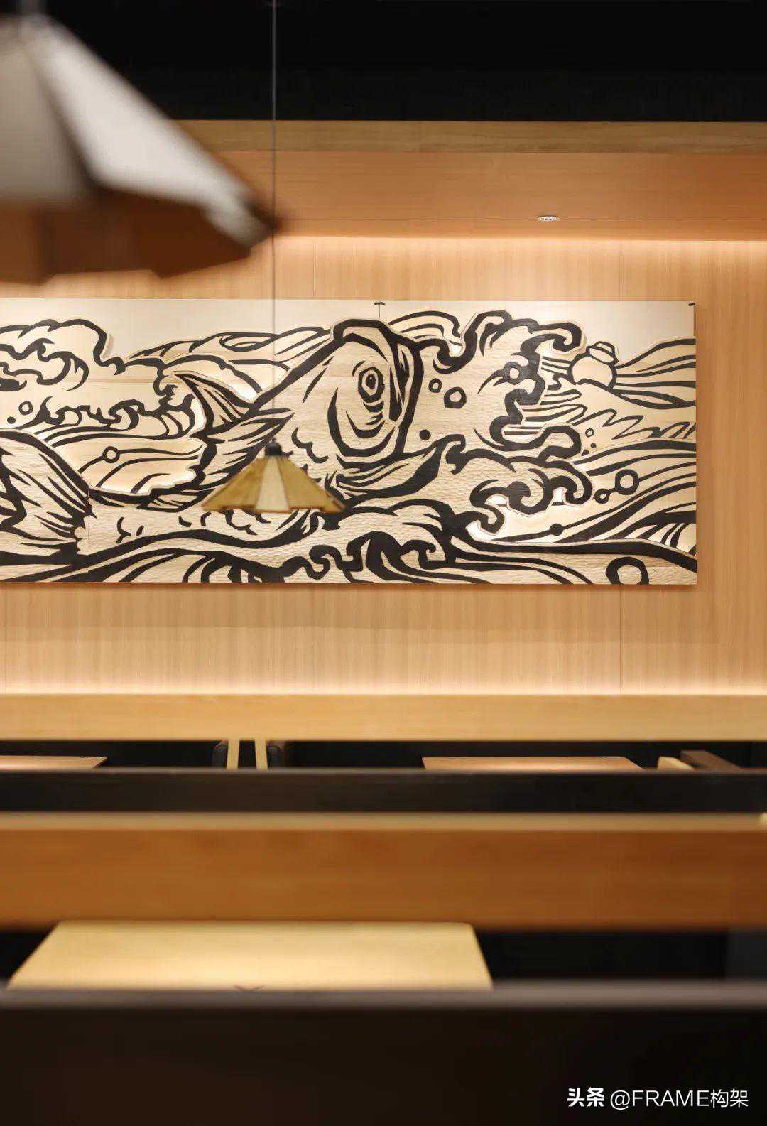 我们融合了中国传统建筑和木结构的组成形式,结合各种具有手工感纹理的材料表现,形成「坊」,以手作的雕琢与研磨精神,展现太二的专注与精致,表达出太二鱼坊下专注做鱼的场景。