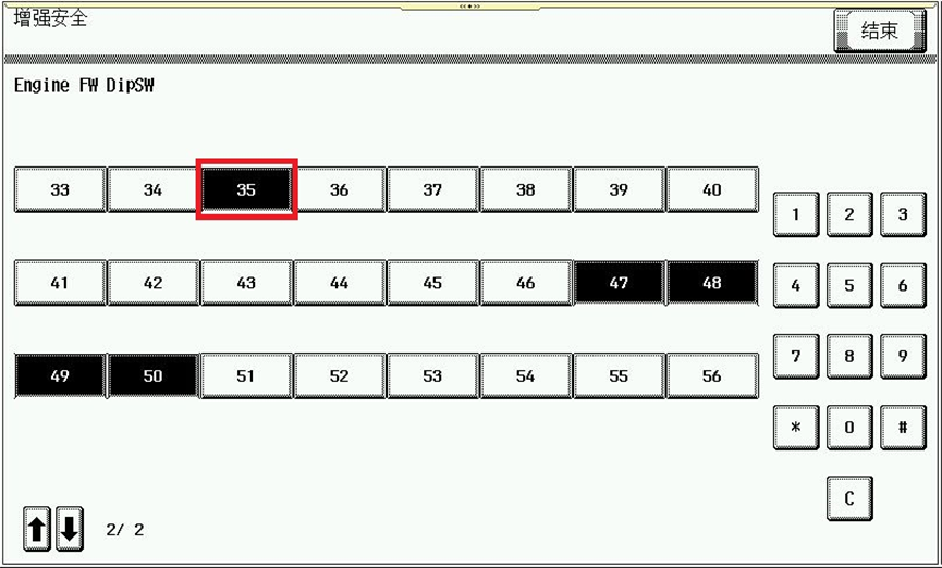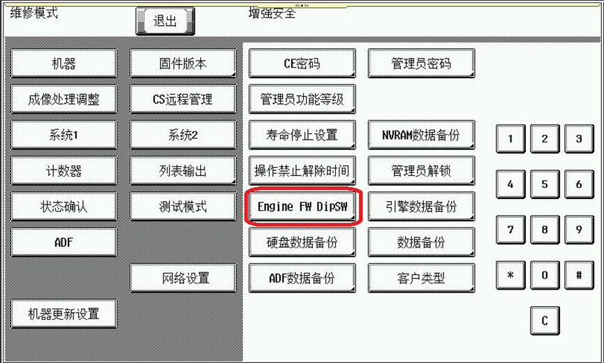 2、点屏幕右上角的【菜单】,点左上角的【计数器】,点【显示小键盘】,依次输入【停止键00停止键01】,若维修模式有密码,则为【9272927292729272】,进入柯尼卡美能达C368【维修模式】,按【停止0C】,进入【增强安全模式】;点【EngineFWDipSW】(引擎固件Dip开关)。