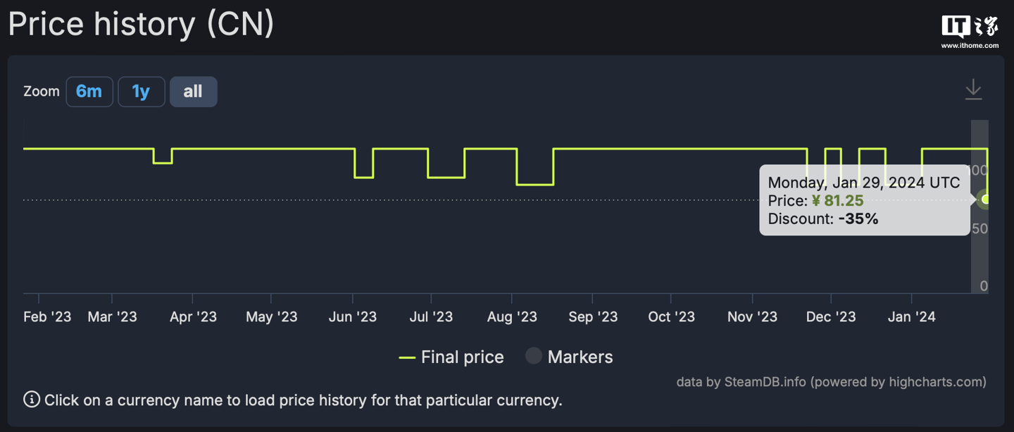 目前这款游戏迎来了发售一周年纪念,官方正在Steam平台进行优惠活动,IT之家查询SteamDB得知,本作Steam国区原价125元,65折后为“史低价”售81.25元,优惠期将在2月6日结束,感兴趣的小伙伴可点此访问商店链接。