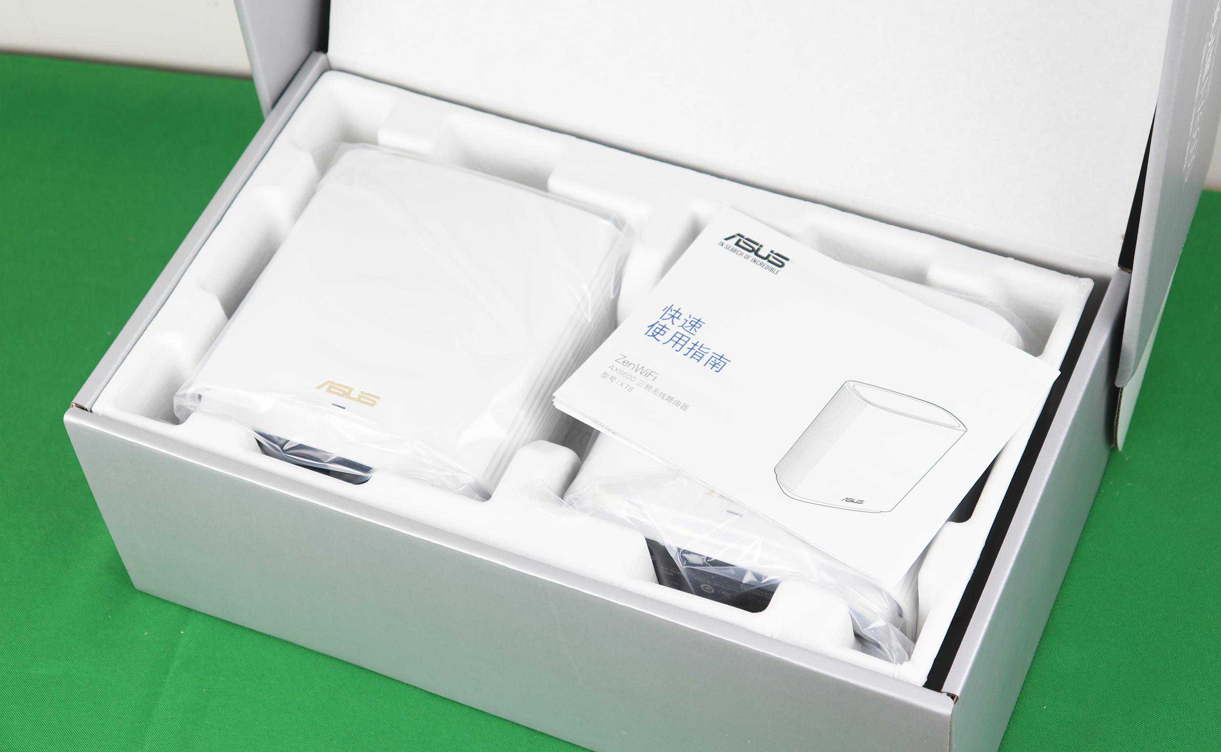 打开包装,可见华硕灵耀路由AX6600躺在里面,而这两个路由器并不是市面上的子母路由器,两个都是主体路由,设计完全一样,无需分主副;一个插上电源连接WLAN,另外一个插上电源就能立即组网。