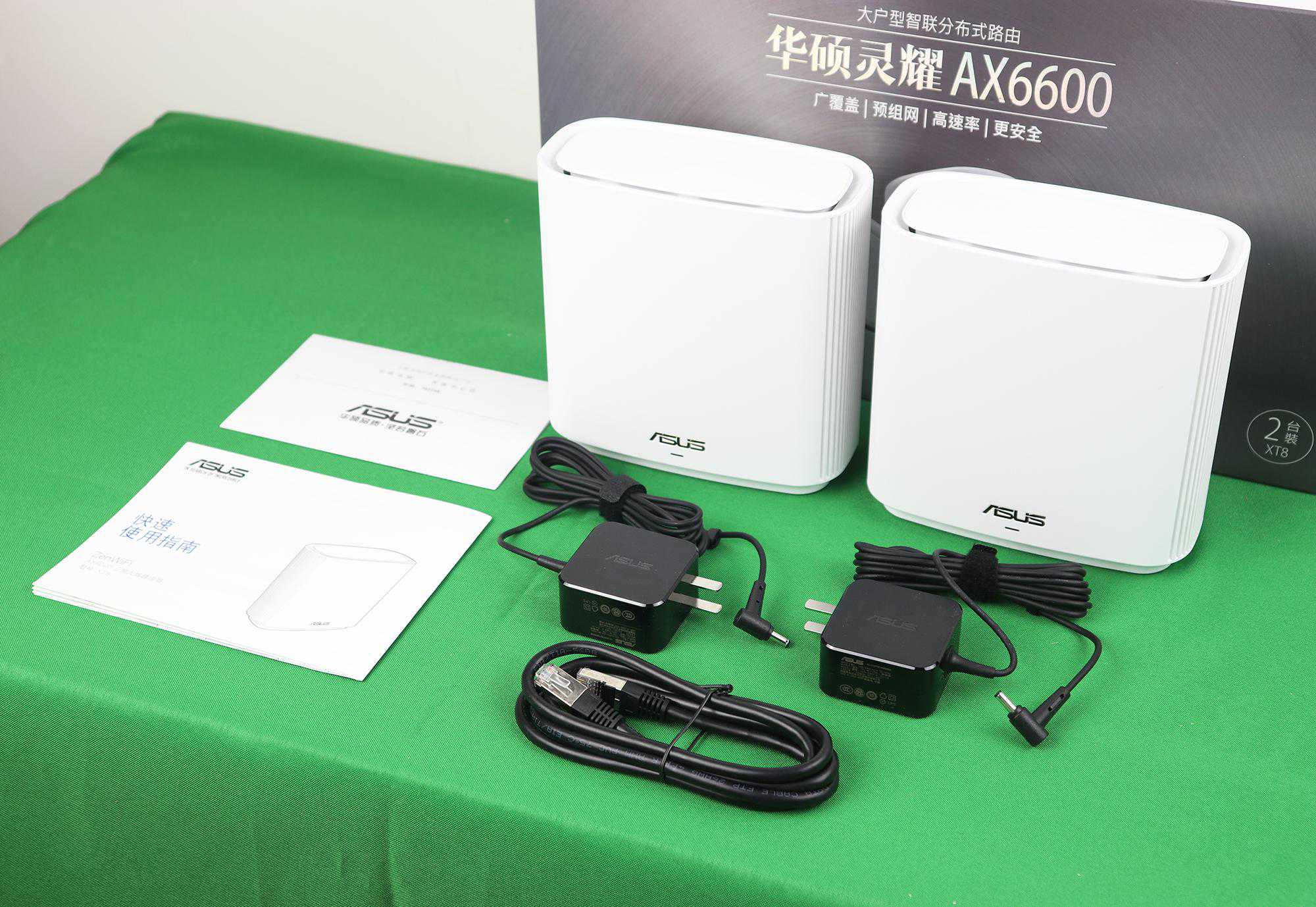 配件包含:华硕灵耀AX6600两个路由器,两个电源适配器,一根网线,一本快速使用指南和一张保修卡,路由器和线材间是黑白搭配。