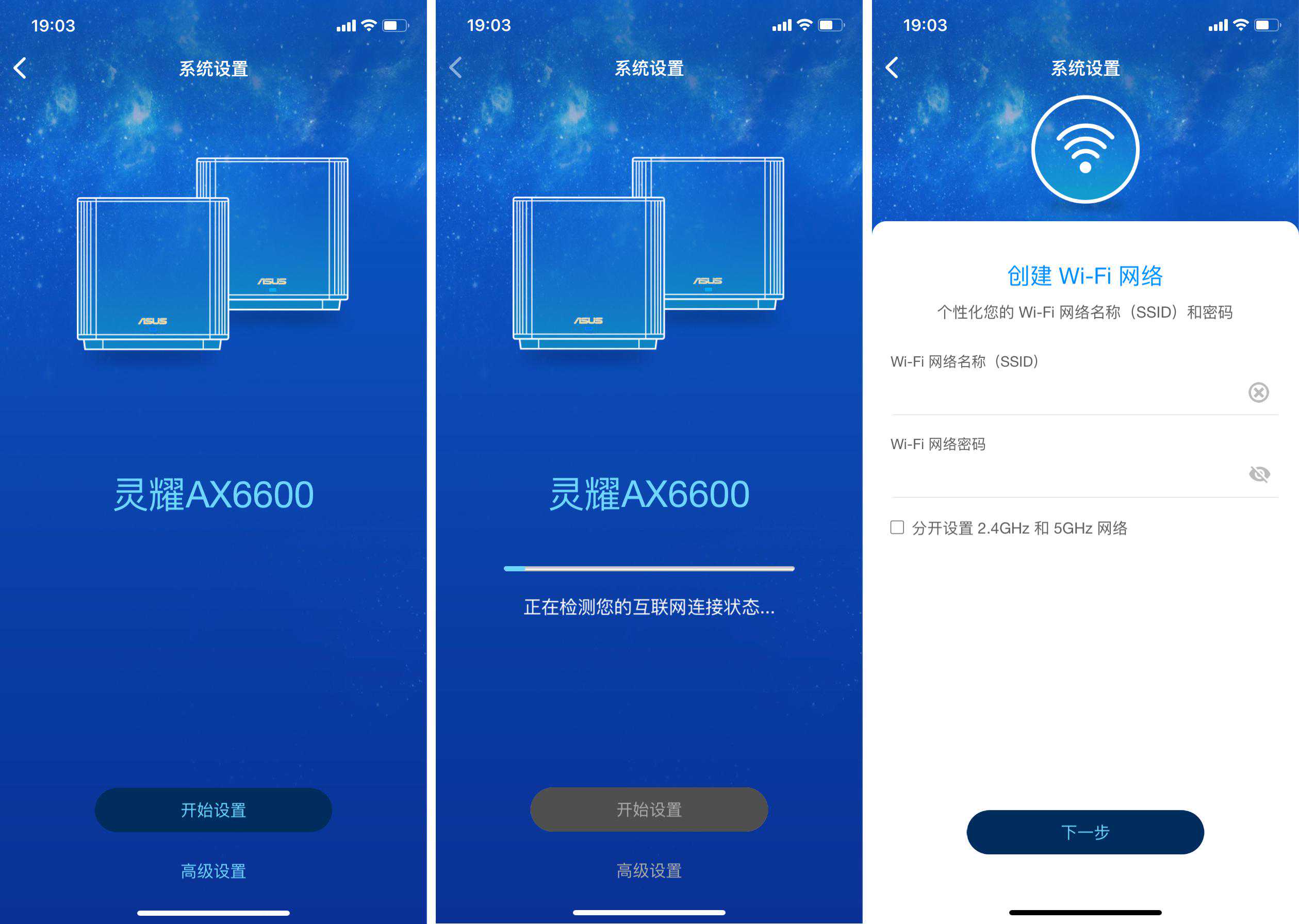接着进行系统的提示设置,灵耀路由AX6600很智能,会自动检测互联网的连接状态,无需进行复杂设置,接着就是创建WIFI网络,即WIFI的名称和密码,可以勾选分开设置2.4GHz和5GHz网络来设置双网络哦。