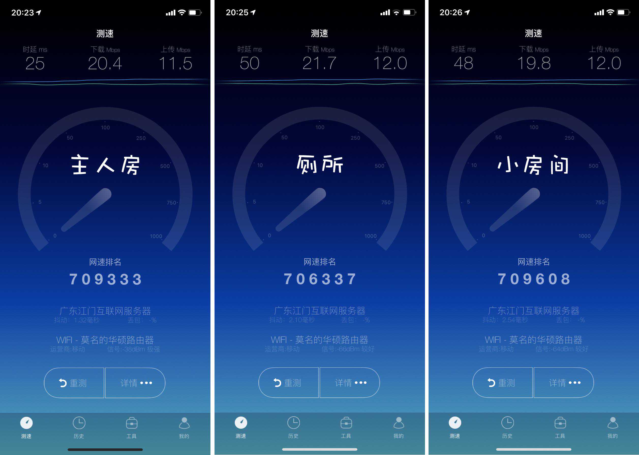 经过多个房间的实际测试,主人房隔着一面墙,里面安置一台灵耀AX6600,所以信号满格;而在厕所因为隔着是两面墙了,所以信号减了一格,但实际测试网速还是流畅的,游戏无阻;而小房间因为离客厅较近,所以信号也是满格,而个家里使用的是移动20M的网络,所以下载和上传速度都不高,而玩游戏是可以流畅无延迟的,下面来玩《王者荣耀》测试下。