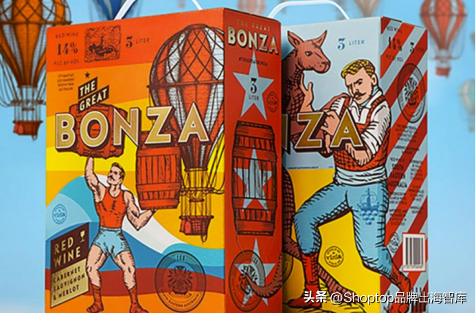 来自澳大利亚的“TheGreatBonza”洋酒品牌,更是将产品包装成马戏团大型演出的剧情,“TheGreatBonza”在包装上放入热气球、驯兽师、马戏团杂耍、表演的动物等元素,以红、黄、橙等暖色系为主色调,很抓人眼球,吸引人的注意力,这与酒毫不相干的包装,恰恰让产品变得有趣和有灵魂,受到海外消费者一度抢购。