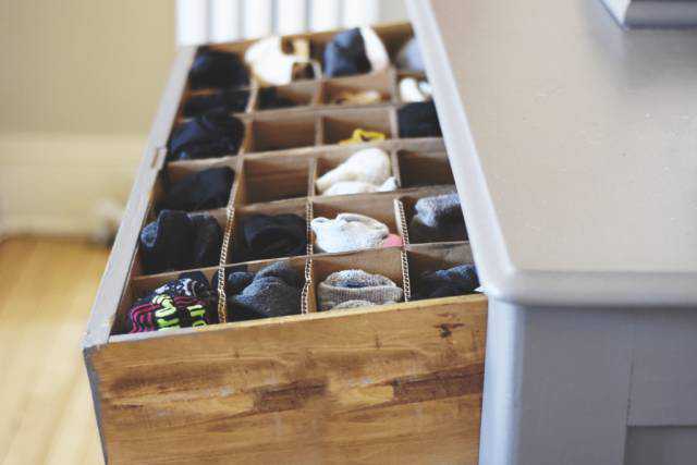 纸箱还能用来做抽屉隔间,剪裁下差不多的宽度,用来收纳袜子内裤等。