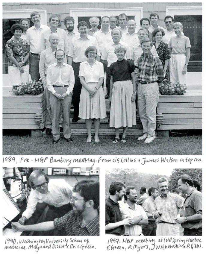 ▷图1989年,人类基因组计划成立前会议合照,弗朗西斯·柯林斯与詹姆斯·沃森位列第一排。图源:pubmed