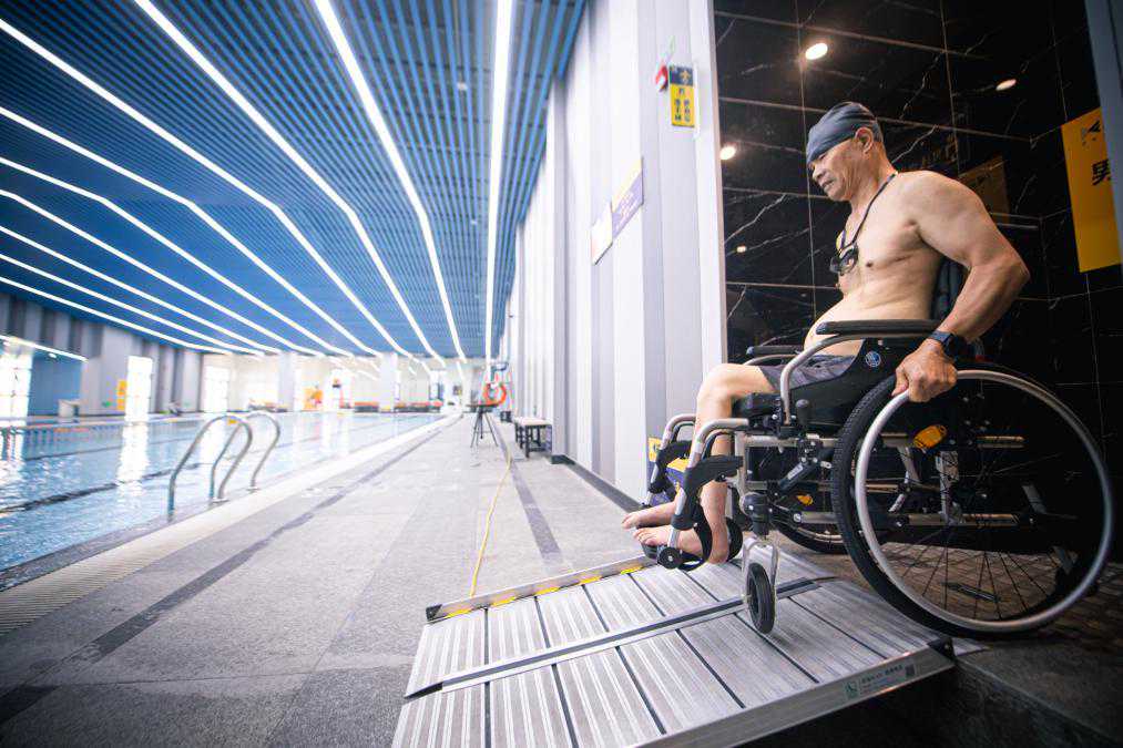 10月19日,残疾人经由无障碍通道进入杭州市钱塘区河庄文体中心无障碍游泳馆。新华社记者江汉摄