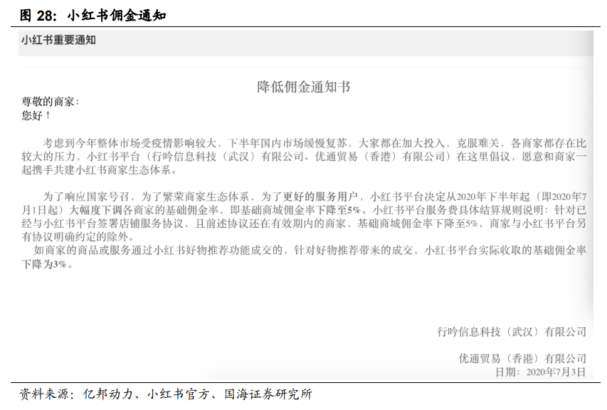 目前小红书的估值是字节的1/9,但收入方面有些能力不足、且偏科严重。根据晚点LastPost的消息,小红书2020年营收约为7.5亿至10亿美金,包括广告和电商两部分。广告业务营收占比约80%,电商业务占比约20%。其中广告营收实现3倍增长;电商GMV(含自营和第三方电商)达到10亿美元,电商业务整体货币化率预计在15%~20%。对于货币化率这一块,小红书在2020年7月出过一个降低佣金的通知,为了缓解疫情下市场的压力,将商城基础佣金率下降至5%。相较之下,快手的电商货币化率为1%多一点,拼多多大概在3%,淘宝为3.7%,京东7%左右。