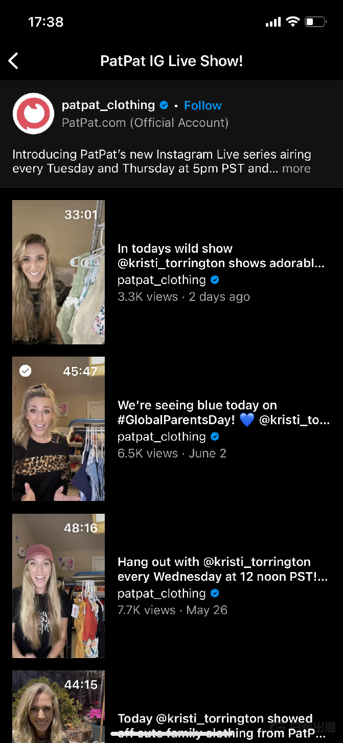 PatPat最新一轮融资获得了软银的1.6亿美元,这是PatPat的D轮融资,之前的资方还包括红杉中国、IDG资本等。PatPat在打法上与SHEIN十分相似,尤其注重深耕社媒运营。笔者注意到,从今年2月以来,PatPat会在Instagram内以每个月3-4次的频率进行直播,每次直播时长在1小时左右。而每次直播的观看量基本在4k-10k。而在TikTok上,PatPat从2021年11月份左右就开始直播了。