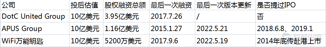 其中,酷量科技在2016-2017年进行了三次融资,共筹集了3.95亿美元;APUS只在2014和2015年进行两次融资,拿到1.16亿美元;WiFi万能钥匙在2008、2015、2017年分别有三次融资,共融资5200万美元。其中APUS和WiFi万能钥匙有过或者传出过IPO计划,但是后来也没有了下文。