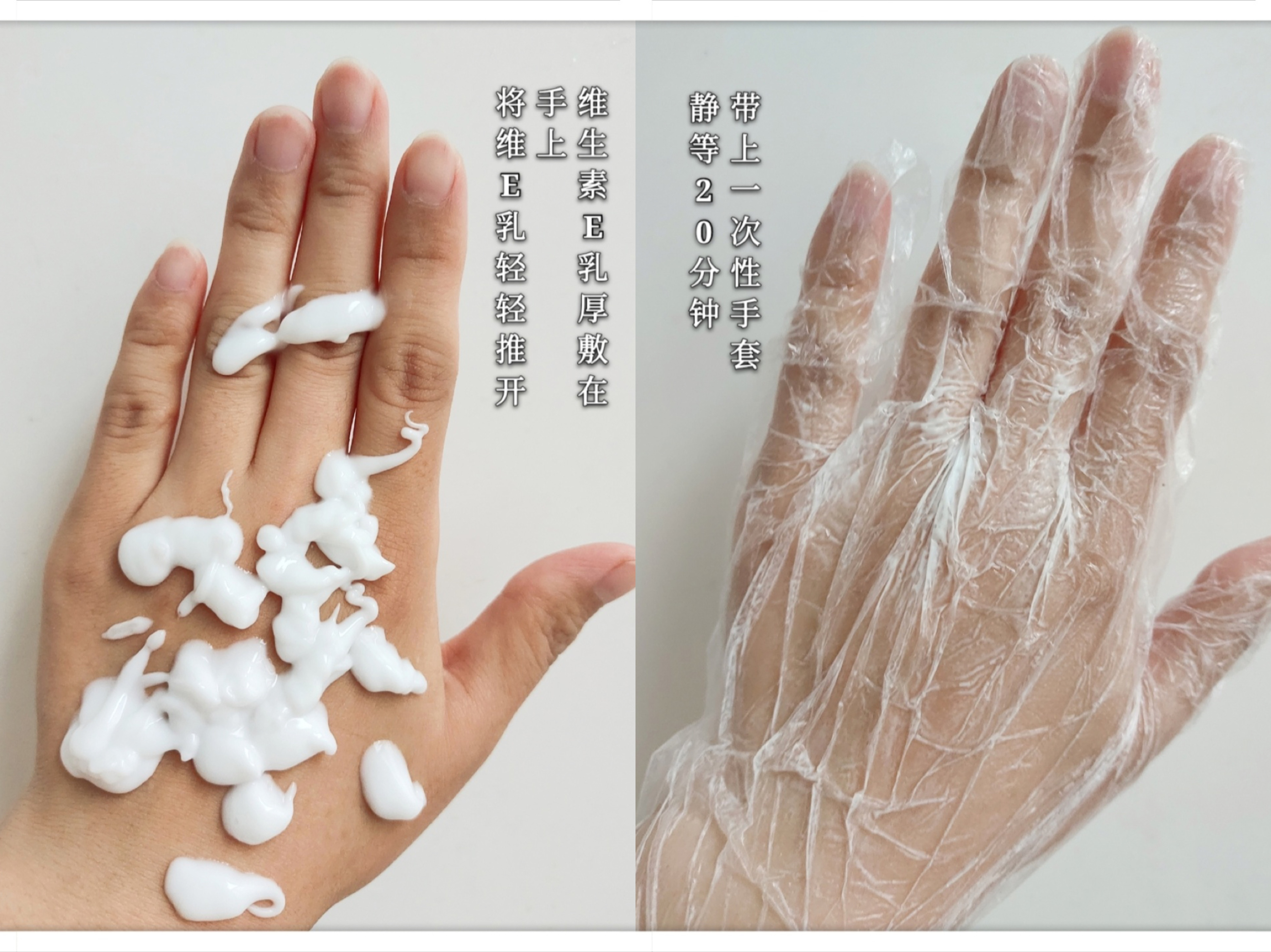 还可以当做手膜用,维生素E乳厚敷在手上,将维E乳轻轻推开,后带上一次性手套或者保鲜膜,静等20分钟。揭开保鲜膜将剩余的维E乳揉搓按摩至吸收,会发现手非常润滑,据说还有美白功效哦。