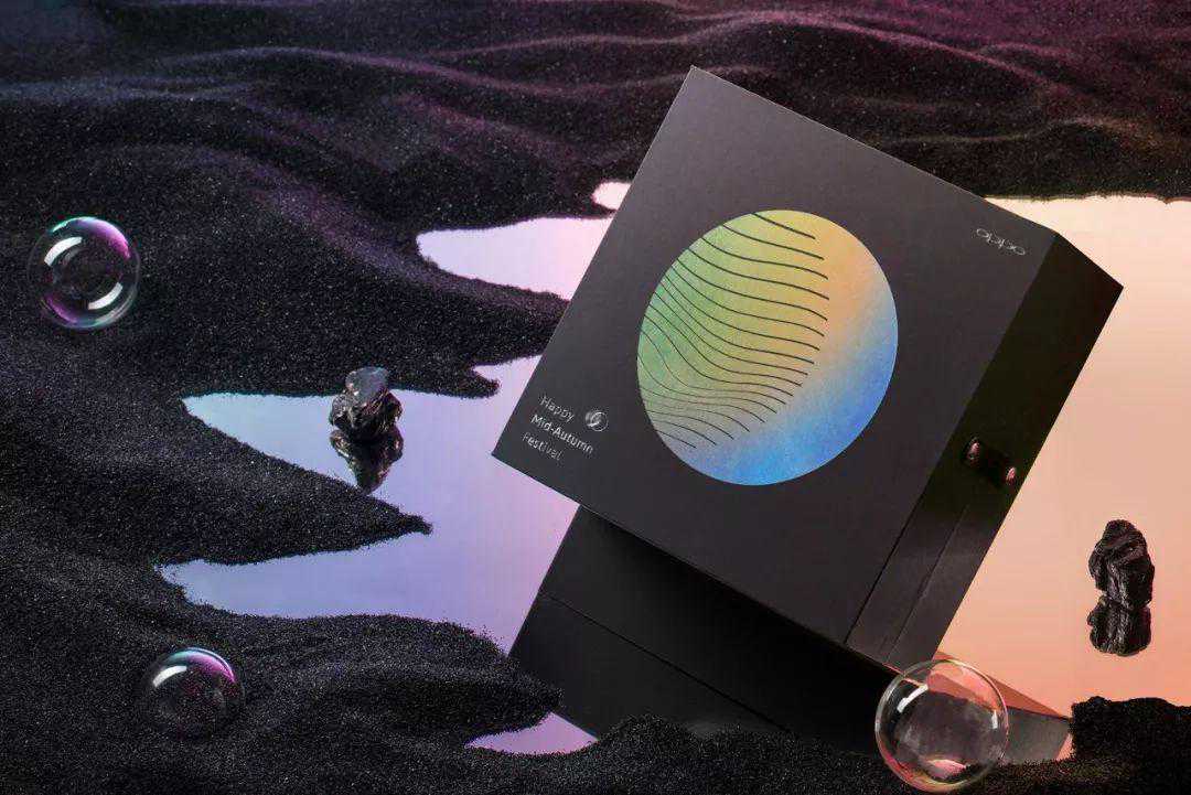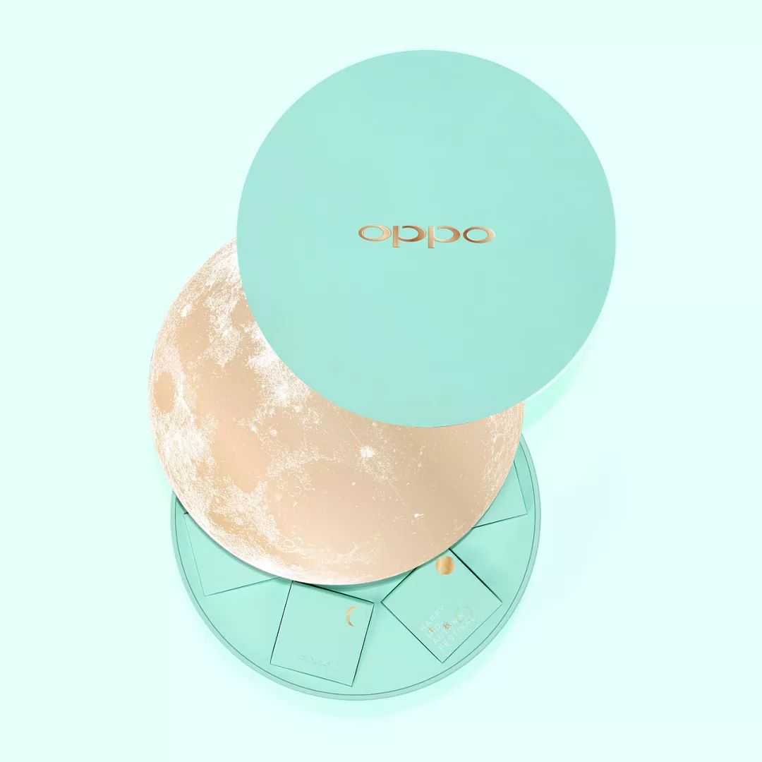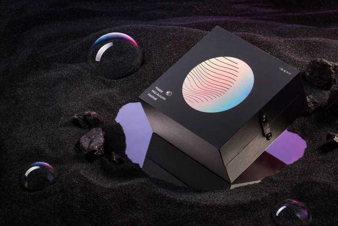 OPPO大月亮外形。侧边抽拉式的打开方式犹如月亮的运行轨迹,包装盒内分为六个小礼盒,中间围绕着一张卡片,每一个月饼小盒上也有不同的月亮元素。