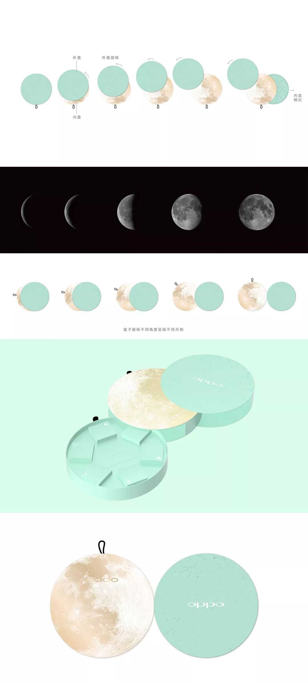 外盒结构上设计了一种形式可以在拿到包装打开的过程中体验月亮的阴晴圆缺变化,来对应包装的主题与趣味性。好包装诉说好故事,好故事传递好产品,好产品打造好品牌。